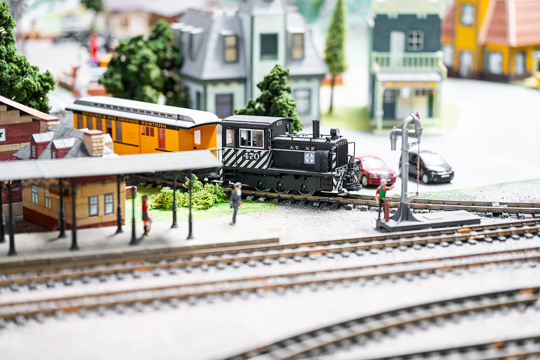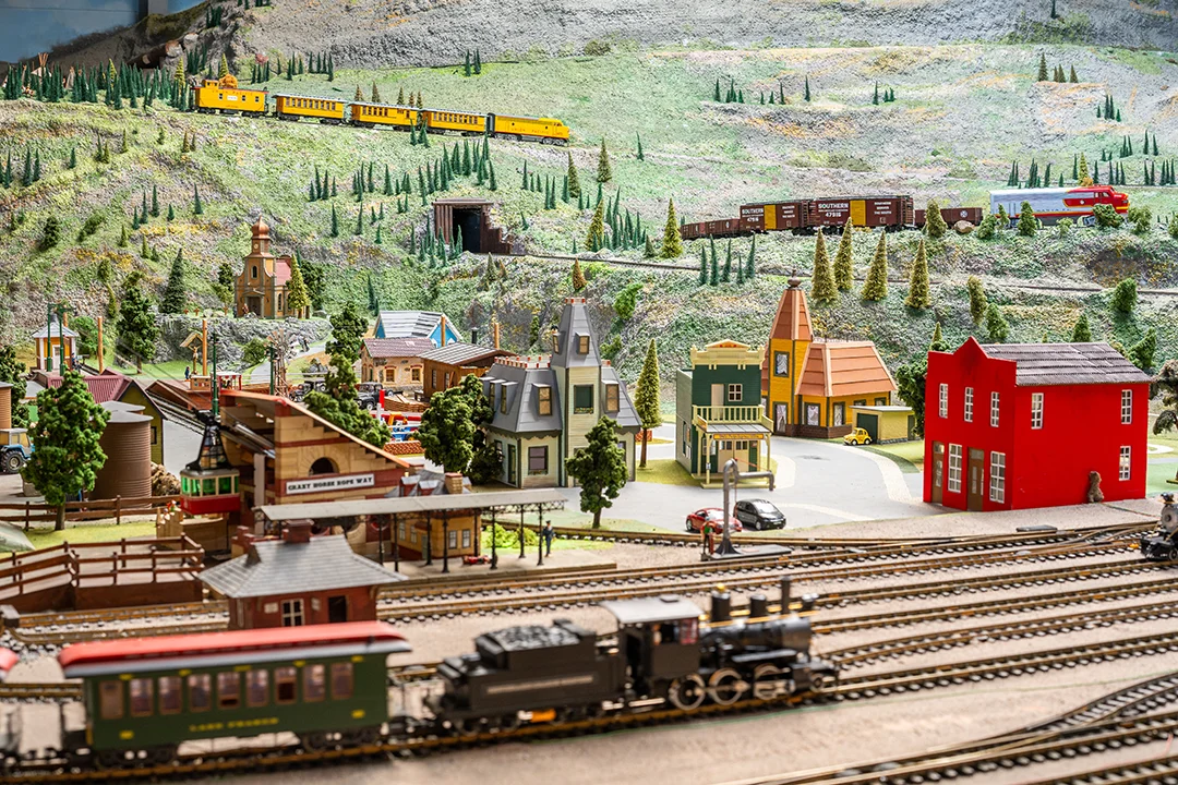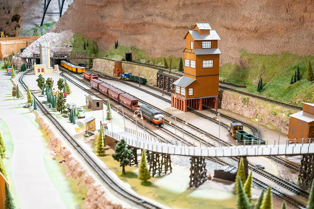 Mit einer Fläche von 1.625 Quadratmetern füllt die Anlage die gesamte Halle. Massive Gebirgszüge türmen sich bis zu sieben Meter hoch auf und schaffen eine imposante Kulisse für Lokomotiven, Waggons und Szenerien. Ob es die prächtige Mogul-Schlepptenderlok der Denver & Rio Grande Railroad ist oder eine mächtige Gelenklok der Uintah Railway – hier wird jeder Zug zum Hauptdarsteller einer epischen Modellbahnreise.